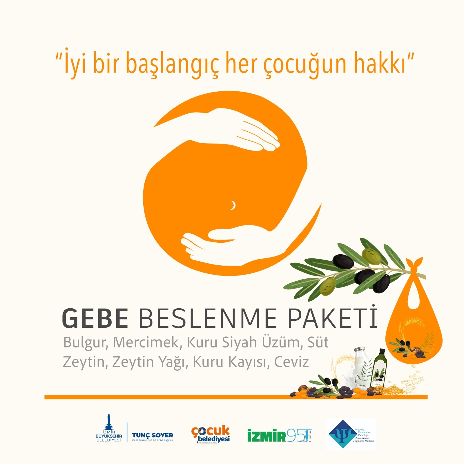 İzmir Büyükşehir Belediyesi hamilelik döneminden başlayarak anne ve 0-3 yaş dönemindeki çocukların gelişimine destek sağlayan “İzmir95” projesini büyütüyor. Sosyal Projeler Dairesi Başkanlığı’nın yürüttüğü İzmir95 projesiyle önümüzdeki günlerde anne adaylarına “Gebe Beslenme Paketi” dağıtılacak. “İyi bir başlangıç her çocuğun hakkı” sloganıyla yola çıkan proje kapsamında İzmir95 Erken Çocukluk Birimi’nin ulaştığı ve bu hizmetten yararlanmak isteyen annelerin evine gebeliklerinin 4’üncü ayından başlayarak 9’uncu ayın sonuna kadar 5 ay boyunca sağlıklı gıda paketi dağıtılacak.