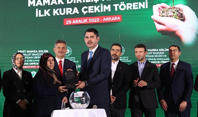“Mamak Yatıkmusluk, Altıağaç, Karaağaç, Hüseyingazi’de, Anayurt ve Gülseren’de 9 bin 146 kentsel dönüşüm konutumuzu da yine sizlere teslim ettik. Son olarak haziran ayında Altıağaç ve Karaağaç’ta yapımını tamamladığımız rezerv konutlardan, Mutlu Mahallesi Riskli Alandaki hak sahiplerimize verilmek üzere 238 yeni yuvamızın kurasını çekmiş, onları da sizlerin hizmetine sunmuştuk. İşte nasıl ki Mamak’ta Mehmet Parlak amcamıza, ‘Sana söz! 6 ay içerisinde temelleri atacağız.’ dediysek ve daha kısa sürede temellerimizi attıysak yine aynı anlayışla bugün de 519 konutumuzu tamamlayarak kuralarını büyük bir coşku içerisinde hep birlikte büyük bir coşkuyla çekiyoruz.” diye konuştu. “İlk Evim, İlk İş Yerim projemiz kapsamında Mamak’ımıza 3 bin 645, Ankara’mıza toplamda 18 bin 139 konut inşa edeceğiz”Bakan Kurum, Cumhuriyet tarihinin en büyük sosyal konut hamlesi olan “İlk Evim, İlk İş Yerim, İlk Evim Arsa” projesi kapsamında Mamak’a 3 bin 645, Ankara’ya toplamda 18 bin 139 konut inşa edeceklerini hatırlatarak “Vatandaşlarımızın, hemşehrilerimizin kendi konutlarını yapacakları, gençlerimizin ilk konutunu sahip olacakları 100 bin konut yapılacak imarlı arsamızı da Ankara’da ilk kez ev sahibi olacak hemşerilerimizin, sizlerin hizmetine sunacağız. TOKİ Başkanlığımız eliyle söz verdiğimiz gibi 2 yıl içerisinde bu projemizi tamamlayacağız. Bu projemizin ilk etabı. 250 bin konut, 1 milyon konut arsası, 10 bin işyerimiz ilk etabı tamamlanır tamamlanmaz hemen ardından ikinci etabın da sürecini de vatandaşlarımızın talepleri doğrultusunda gerek Mamak’ımızda, gerekse Ankara’mızın tüm ilçelerinde ihtiyaç sahibi vatandaşlarımız için yapmaya devam edeceğiz.” dedi.Cumhurbaşkanı Recep Tayyip Erdoğan’ın 2018 yılında müjdesini verdiği 81 ilde 81 milyon metrekare millet bahçesi yapma hedefini kararlılıkla sürdürdüklerinin altını çizen Bakan Kurum, “Bu azimle tüm Türkiye’ye tam 468 millet bahçesi kazandırıyoruz. Bunlardan 164’ünü tamamlayarak evlatlarımıza, gençlerimize, vatandaşlarımıza armağan ettik. Ankara’mızda da toplam büyüklüğü 4.8 milyon metrekare olan 24 millet bahçesi projemiz var. Bunlardan 11’ini tamamlayarak sizlerin hizmetine sunduk. Mamak’ın ilk millet bahçesi olan Üreğil Millet Bahçemizin açılışını hep birlikte gerçekleştirdik. İşte bugün de Mamak’ımızda şehit öğretmenimizin hatırasını yaşatacak Hamza Halit Sülün Millet Bahçemizde ilk fidanlarımızı toprakla buluşturuyoruz. TOKİ Başkanlığımızca Mamaklı vatandaşlarımız ve yavrularımız için hayata geçirdiğimiz en nadide, en gözde eserlerimizden birisi olacak bu millet bahçemiz, tam 58 bin metrekare büyüklüğe sahip olacak. Bahçemizde, yeşilin içerisinde çocuk oyun alanları, tematik bahçeler, millet kıraathanesi, kadın kooperatifi, bisiklet ve yürüyüş yolları, otopark ile mescit yer alacak. Bu güzel eseri de inşallah 2023 yılı içerisinde tamamlayacağız, Mamak’a, Mamak’ın gençlerine, çocuklarına armağan edeceğiz.” dedi.“Bizim bir Ankara hayalimiz var”Bakan Murat Kurum, dört bir yanı millet bahçeleriyle donatılmış, her noktasında temiz enerjiyi kullanan, atığını dönüştüren, kendi enerjisini üreten, istihdama, ekonomiye katkı sağlayan, depreme karşı dayanıklı, kültürel dokusu korunmuş, yatay mimariye sahip bir Ankara hayali olduklarını da sözlerine ekledi.Konuşmasının ardından Mamak Diriliş Mahallesi Kentsel Dönüşüm Projesi için ilk kuraların çekimini başlatan Bakan Kurum, ardından Şehit Hamza Halit Sülün'ün adının yaşatılacağı millet bahçesinde ilk fidanları toprakla buluşturdu. Millet bahçesi kütüğüne Şehit Hamza Halit Sülün'ün adı çakılarak dualar edildi.